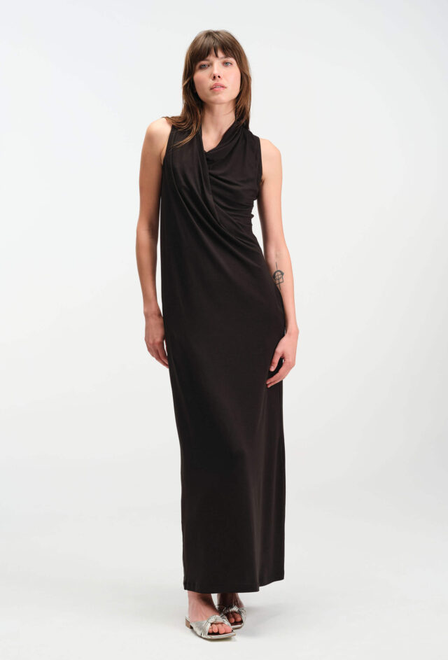 Ankle-length Tencel dress with a draped neckline and side pockets.